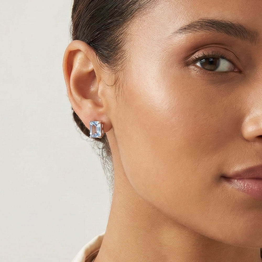 Crafted from premium sterling silver, these stud earrings feature brilliant aquamarine cubic zirconia stones that capture light with exceptional clarity. The secure stud setting ensures comfortable, everyday wear, while the cool blue hue complements any complexion. Complete the look with our matching necklace.